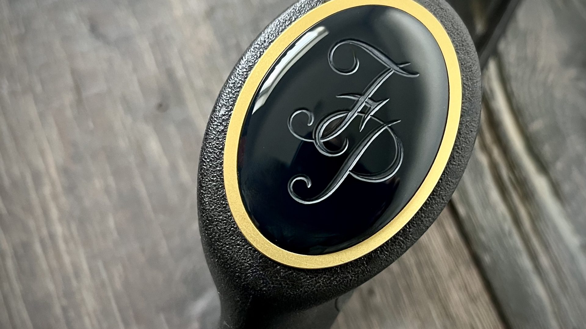Wappengravur im Messergriff Wappengravur in Onyx mit Goldrand vertieft in einen Messergriff eingelassen. Es können alle besonderen Wünsche umgesetzt werden.