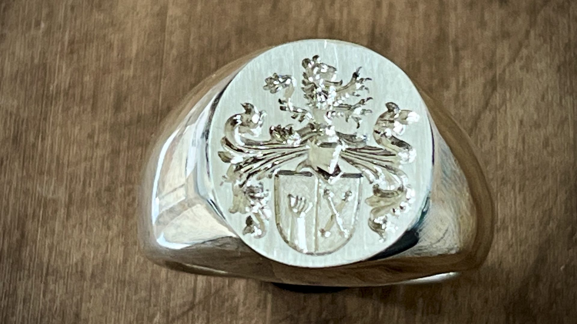 Wappenring mit Reliefgravur SR12 Das Wappen ist erhaben als Relief dargestellt. Aufwändige Handgravur in einem Wappenring aus Gold.